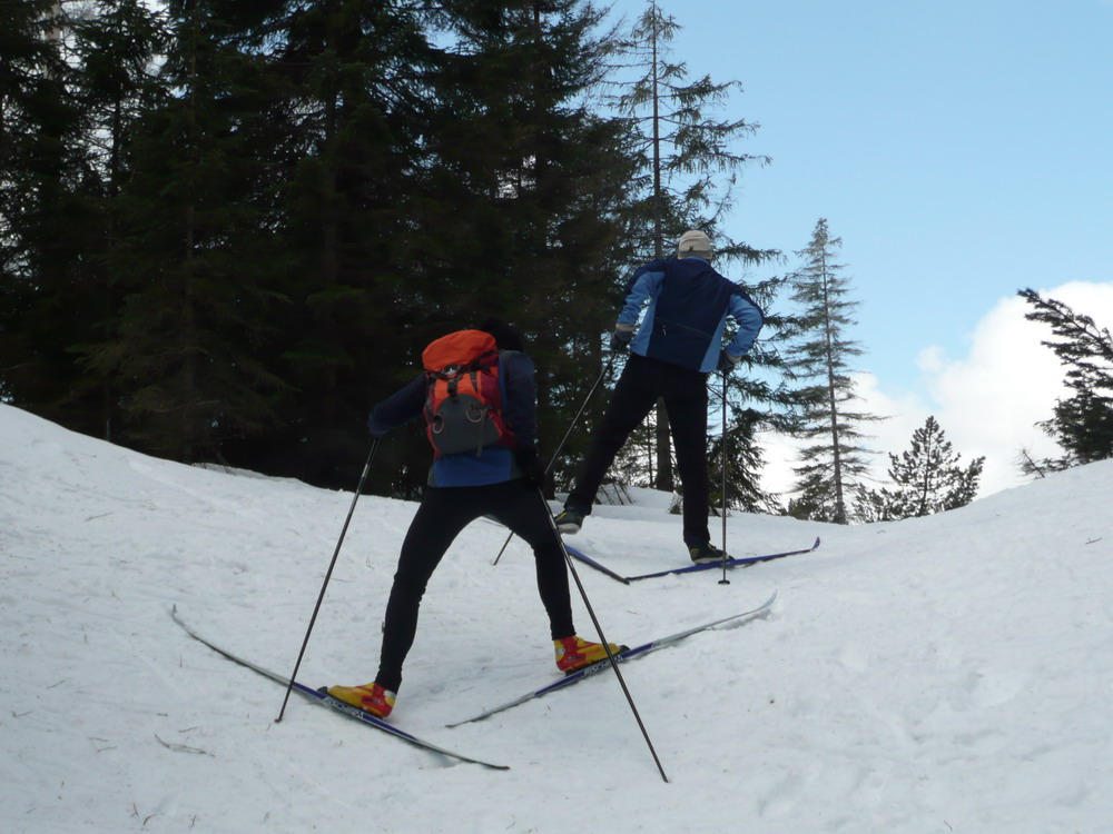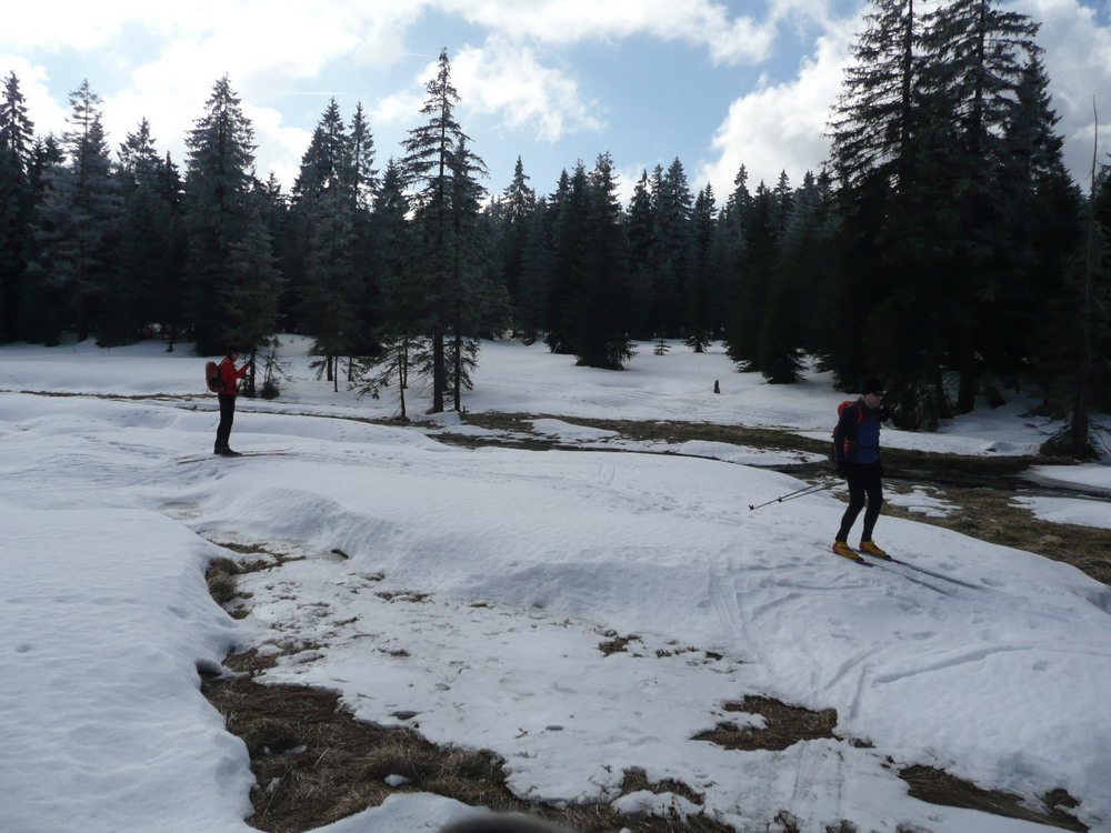 Lange wird der Schnee nicht mehr liegen, aber das Wetter konnte nicht besser sein. Frost und strahlend blauer Himmel machten die Fahrt über den Kamm noch einmal zum Erlebnis. Abseits der Touristenpfade fanden wir auf tschechischer Seite Pulverschnee und Bibernester. Es ging über ausgedehnte Wiesen und unbekannte Wege. Der Weg zurück sollte man über „Toms Hütt“ in Weitersglashütte nehmen.