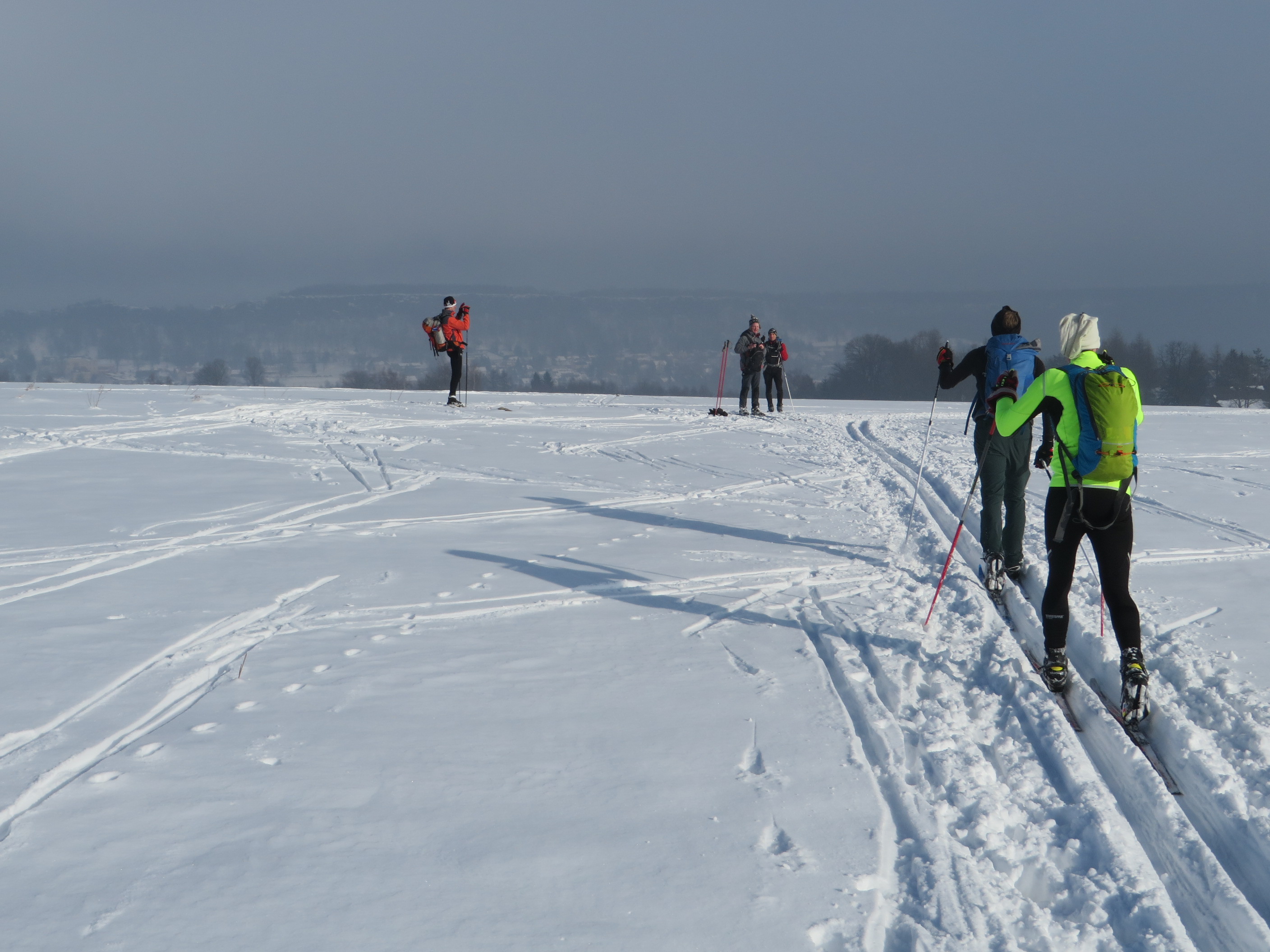 Natürlich waren wir nicht die Einzigen, schon der Bus nach Altenberg war voll. Vom Einstieg in Zinnwald ging es die ersten Kilometer erst einmal durch gut gespurte Loipen bis zum Mückentürmchen und weiter Richtung Autobahn. Die war schon weit zu hören, bis zur Überquerung, da ist sie im Tunnel. Ab Adolfov gab es dann wie erwartet nur noch eine getretene Spur, aber wir waren ja zum Glück nicht die Einzigen 😉 . Dadurch war auch die Umfahrung des Schneeberges gut zu finden, die bot mit den zwei steilsten Abfahrten des Tages jede Menge Gelegenheit zum gründlichen Nachmessen der Strecke.
