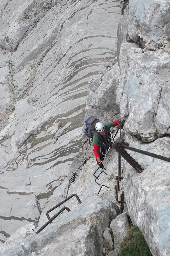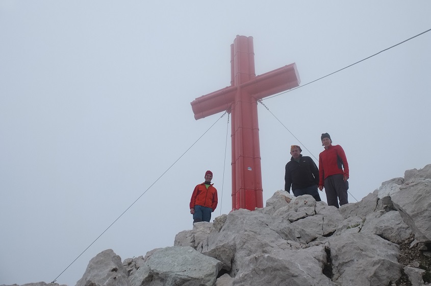 Mittwoch, nebliges Wetter, es soll niederschlagsfrei bleiben – also LOS: Bert – Rinesch – Klettersteig auf den Großen Priel. Sachsenmäßig brauchen wir etwas länger als angegeben, aber kommen eben doch an. Für Unruhe sorgte ein immer wiederkehrender Rettungshubschrauber, den man nur hörte, aber wegen des Nebels nie sah. Des Rätsels Lösung gab es am Abend auf der Welser Hütte: Die Bergwacht trainierte Bergungen mit dem Hubschrauber.