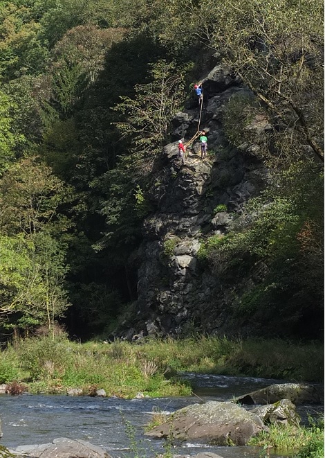 ElsterwandUnser Seil konnte wieder etwas Sonne vertragen, das andere Seil hatte noch nie die Sonne gesehen und dem dritten Seil war noch ganz schwummrig vom Schleudergang der letzten Waschung. Da ist eigentlich klar, wer da heute gemeinsam im Steinicht war. Als Ziel  wurde die Elsterwand erwählt und der Zustieg kurzerhand durch den Kleppergrund gelegt. Die Elsterwand bietet Kletterwege bis 30 m Länge, verschiedene Schwierigkeitsgrade  und fantastische Ausblicke.