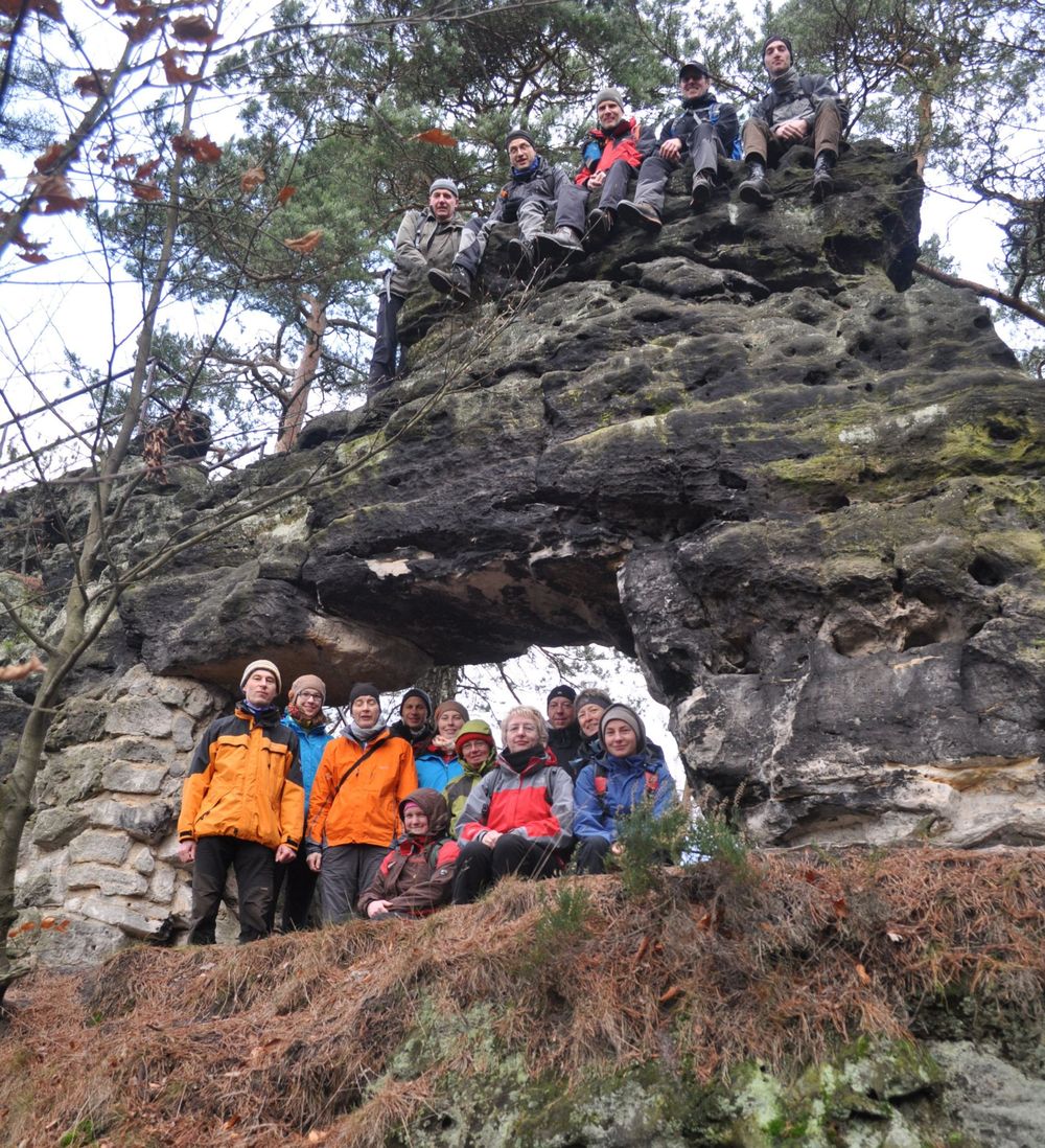 Kleines PrebischtorDie U40 ist das Treffen zum Jahresausklang schlechthin und die Gelegenheit, selten besuchte Orte kennenzulernen. Die Nacht war um sechs zu Ende. Der Bus kam um acht. In diesem Jahr begann der Tag in Vysoká Lípa (Hohenleipa) mit einer Aussicht von der Felsenburg Šaunštejn (Schauenstein). Nicht weit entfernt steht das Kleine Prebischtor. Von dort sind wir den Treppengrund hinunter zur Wüstung Hinterdittersbach gelaufen, an der Kirnitzsch entlang den Hermannsteig hinauf zur Schlegelhütte. Am Gasthof Erbgericht in Hinterhermsdorf war gerade noch Zeit für einen Kaffee, dann kam der Bus. Zurück in der Hütte gab es Leckeres aus der Stollenbäckerei und seltene Speisen zum Abend von Holm und Wolfgang. Und draußen stürmte und schneite es.
